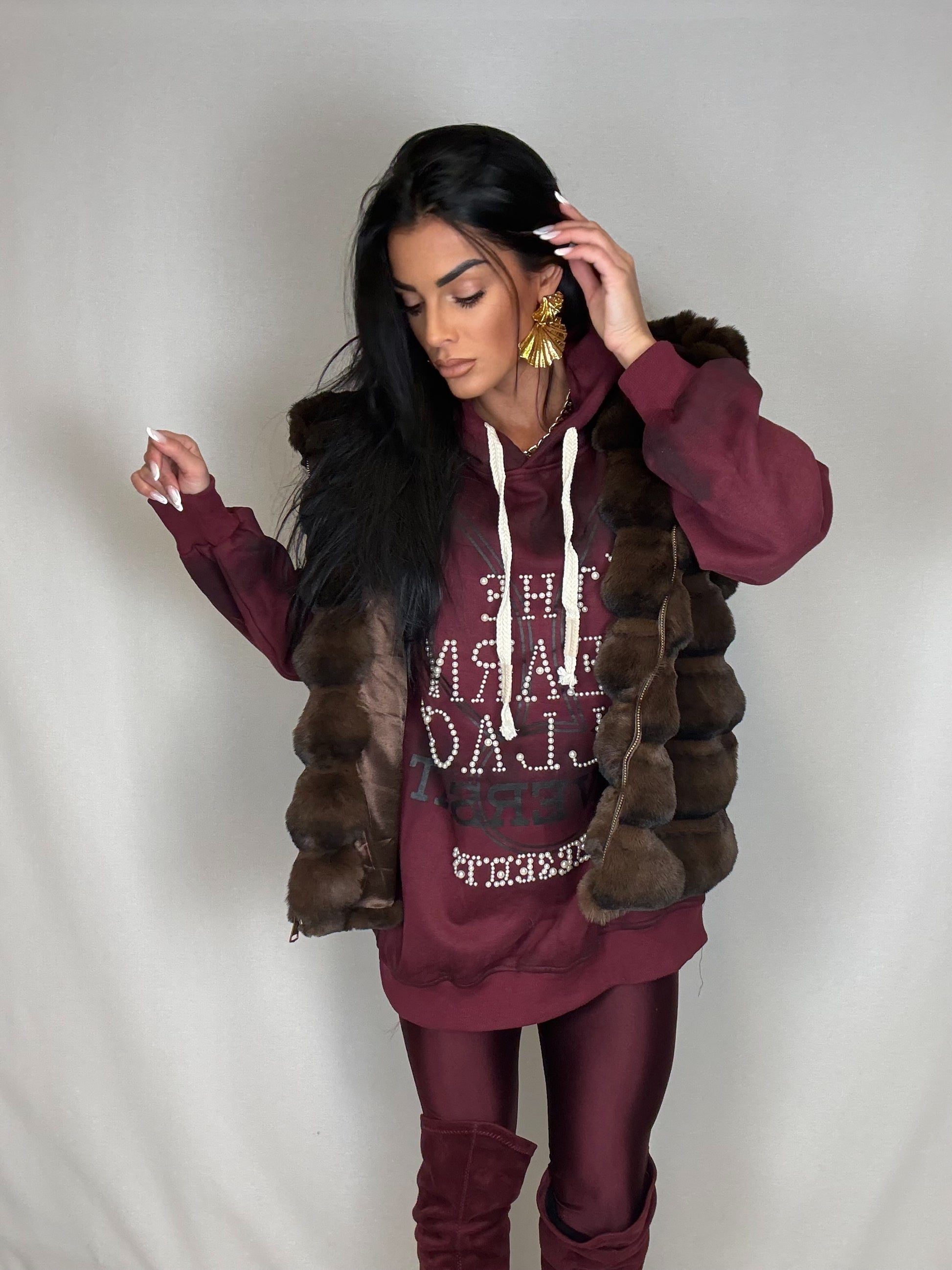 Gilet in eco-pelliccia color marrone con chiusura a cerniera e grande cappuccio
